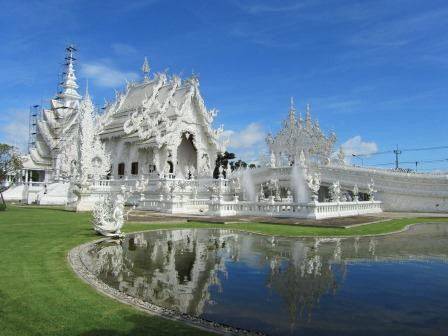 雕工細緻造型繁複的白色佛殿,外層鑲上一塊塊鏡面玻璃,讓陽光的閃耀更加亮眼,鏡白與天藍呈現了廟宇絕無僅有的獨特風華